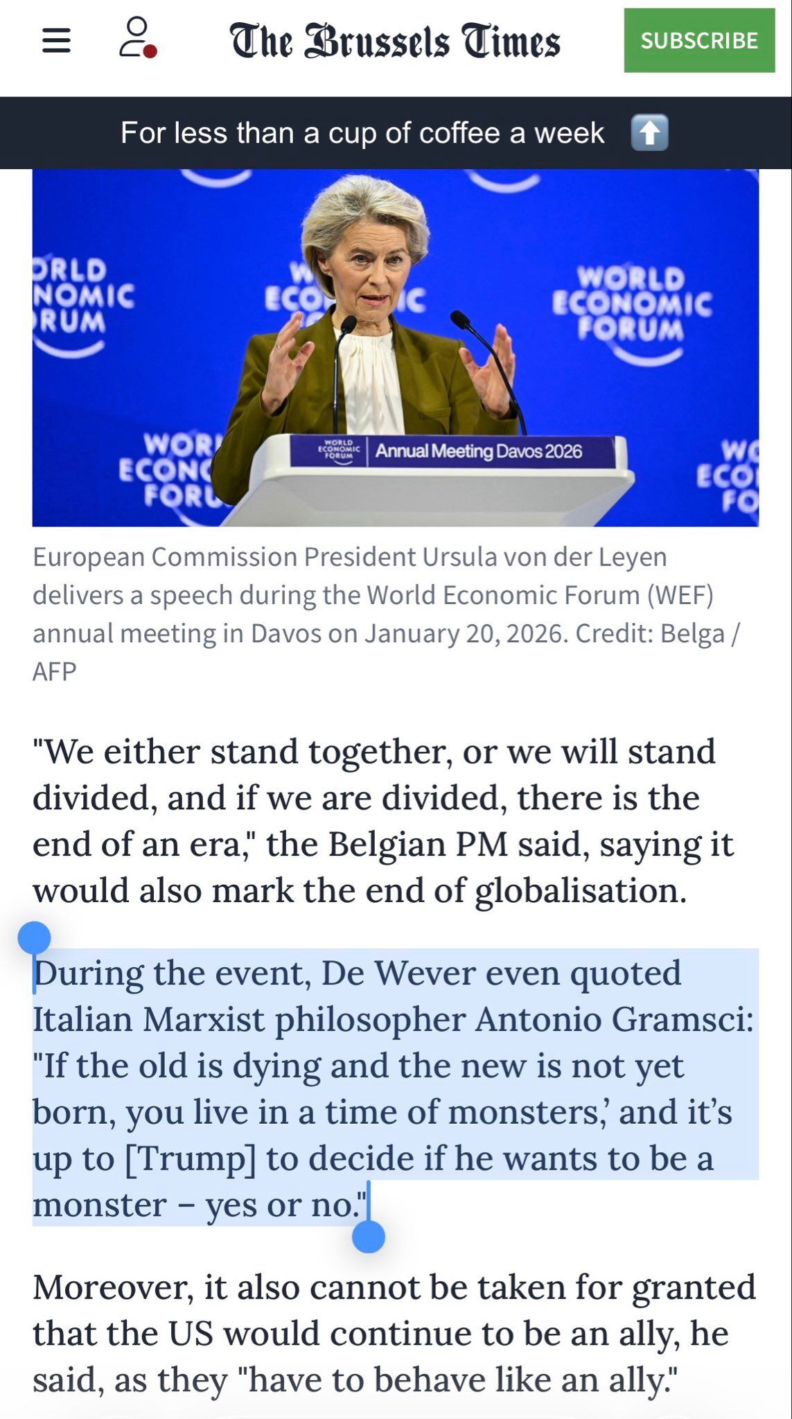 Last week, Belgian PM Bart De Wever delivered a speech at the World Economic Forum in Davos, invoking this famous quote commonly attributed to Antonio Gramsci about the “time of monsters” amid the uncertainties of a shifting global order.